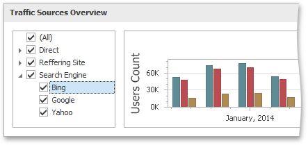 The Dashboard allows you to use any data aware dashboard item as a filter for other dashboard items (Master Filter). You can select elements in a Master Filter item (grid records, chart bars, pie segments, etc.) to filter data in other dashboard items by the selected values.