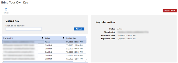 Disable key management by clicking the Disable BYOK button. BYOK will be disabled and your data will be managed by the service.