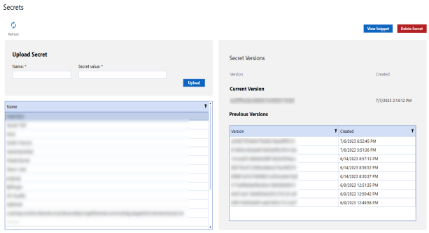 Select a secret to view the current version number, previous version number, and creation dates.
