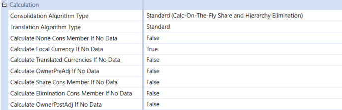 Standard (Calc-on-the-fly Share and Hierarchy Elimination): Standard (Calc-On-The-Fly Share and Hierarchy Elimination) is the most used Consolidation Algorithm Type. This Cube setting calculates an Entity’s Share amount dynamically (the value does not get stored in the application database Data Record tables). Share is a Consolidation Dimension Member defined for a specific Parent/Child relationship and is calculated as an Entity’s (translated balances + owner pre-adj journals * percent consolidation). Eliminations under Standard are calculated using OneStream’s built-in algorithms.