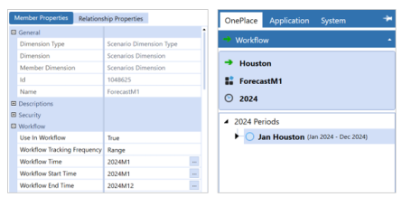 In the below example, the ForecastM1 scenario member has a Workflow Tracking Frequency of Range, WFStartTime of 2024M1, and WFEndTime of 2024M12. If the Workflow POV is ForecastM1 and 2024M1, then T#Root.WFTimePeriods returns 12 time members, 2024M1 through 2024M12.