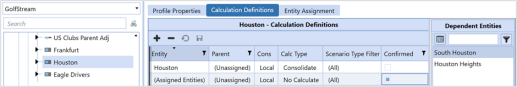 In the below example, the Houston Workflow Profile has the Confirmed Filter selected for the Assigned Entities, South Houston and Houston Heights, within the Calculation Definitions.
