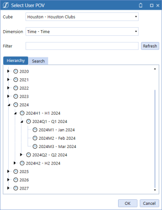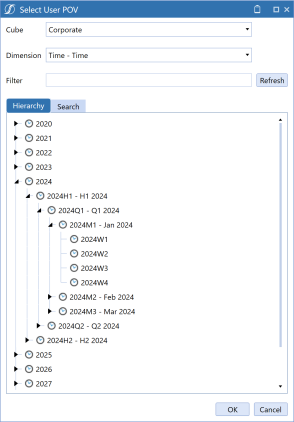 The time hierarchy is not tied to a calendar year. It can be configured to fiscal year by using the fiscal year and Month1 (M1), Month2 (M2), and so on to designate the time frame.