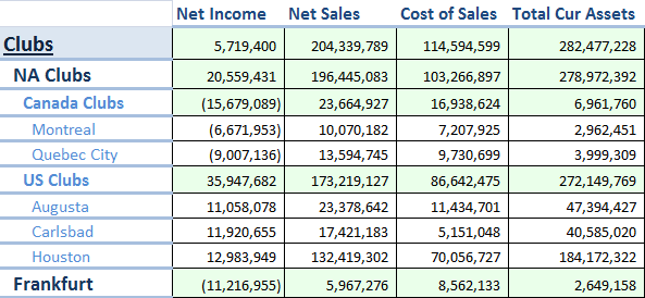 If there are multiple named columns or rows in the Cube View, go to the intersection-based Named Regions and use different formatting to differentiate sections. For example, a Total row is separated from detailed data. This combination of Named Regions and Styles generates a nicely formatted report: