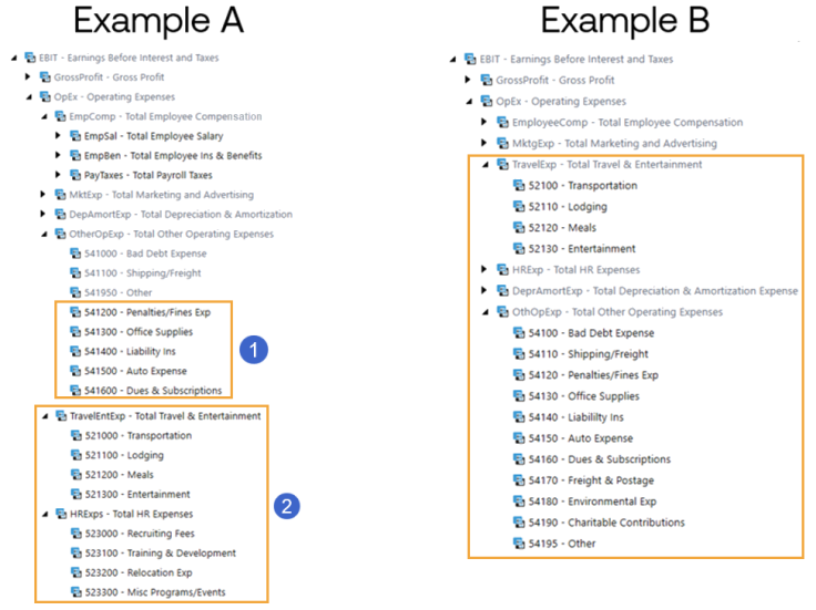 The parent accounts TravelEntExp and HRExps are extended from the parent account OpEx.