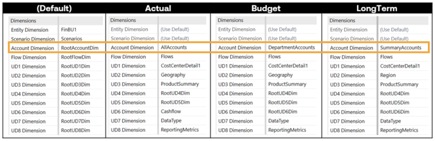 Assign account dimensions to a cube after designing and creating them extensibly. Utilizing the flexibility provided by horizontal extensibility is dependent on proper cube dimension assignment. Non-data unit dimensions, Account, Flow, and UD1-UD8, should be applied in the specific Scenario Types in use. Any unused dimension in those active Scenario Types should be assigned to the Root dimension, for example, RootUD4D. Assigning the Root dimension instead of leaving each dimension type set to (Use Default) enables changes to that dimensional assignment later and activation for data input in the future. You can only update from the Root dimension to a specific dimension once. Changing from a Root dimension is a one-time change that cannot be reverted if there is data in the cube and Scenario Type combination.