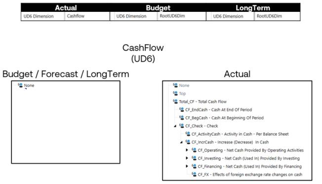 Horizontal extensibility allows this variability when designing scenarios, cubes, and global applications. Using horizontal extensibility across Scenario Types allows you to create a targeted user experience by adding or removing members and entire dimensions from scenario types where they are not valid. The examples above display processes occurring at different levels in the same hierarchies. Horizontal extensibility also creates flexibility when an entire dimension is not valid. The CPM Blueprint application’s CashFlow dimension is assigned to the Actual scenario type, meaning all Cash Flow members are included and valid in scenarios created with that Scenario Type. In the active planning scenario types, Budget, Forecast, and LongTerm, the Root dimension is assigned on the cube properties because only the None member is valid.