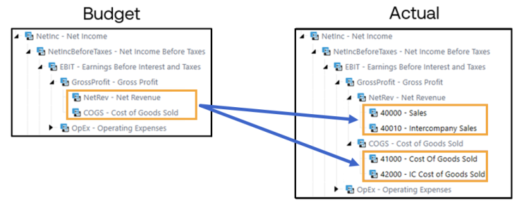 Through horizontal extensibility in OneStream, you can create a single common set of metadata with input levels that can follow each distinct process need An example of this function is a budget or forecast that is completed at a more summary level than the actual financial data. In the CPM Blueprint application, the Account dimension contains this type of extension. Net Revenue is the base input member for budgeting and forecasting in this application, while actuals are captured at a lower granularity.