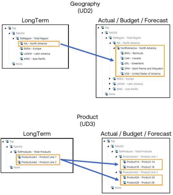 This example is within the Account dimension, but you can apply this concept across multiple OneStream dimensions. In the CPM Blueprint application, this type of horizontal extensibility is used in the LongTerm Scenario Type, because the application's long-range planning process takes place at a summary level. Like budgeting and forecasting, the account input is at the Net Revenue level. In the LongTerm Scenario Type, input into the Geography and Product dimensions vary from actual, budget, and forecast.