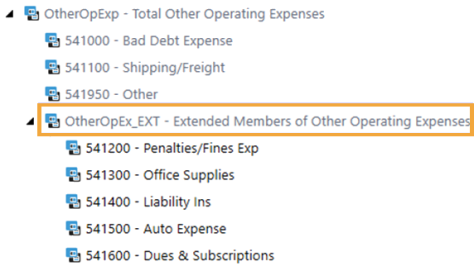 Only the member OtherOpExp is included in the parent dimension and all child accounts are included in the extended dimension. Input in the parent dimension would be aggregated to the OtherOpEx level without the breakout of 541, 541100, and 541950.