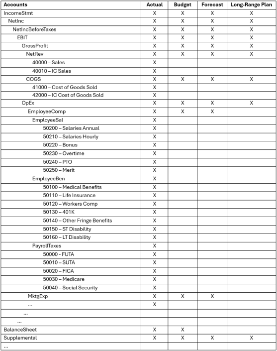 This chart visualizes that actuals and long-range planning should utilize separate Scenario Types to vary the inclusion and exclusion of entire dimensions. Next, build a chart that provides clarity for the differences between shared dimensions. As determined from the previous chart, all four processes need accounts. To determine which accounts are needed, compile a list of all possible members and hierarchies and repeat the process to identify where they should be valid.