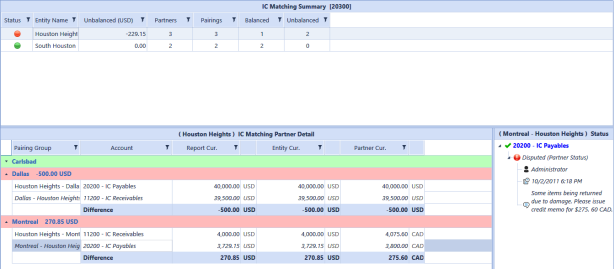 Houston Heights is shown in red because there is a $229.51 discrepancy. Details on the discrepancy are shown in the lower part of the screen. Houston Heights’ discrepancy with Montreal is shown at the bottom in the application reporting currency (USD), Houston Heights’ currency (USD), and the partner currency for Montreal (CAD). Through the right click menu, leave a status and description that each partner can see. As these values roll up the Entity structure, the Parent Entities can also see this detail.