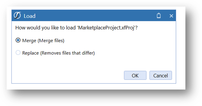 The file load using the defined .xfProj file provides a seamless link to the project files. When loading an .xfProj file, the user is presented with options to “Merge” or “Replace” the target files. The only files affected are those defined by the .xfproj file.