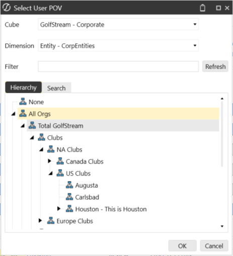 This is active and available to be updated by the end user. Each Dimension will need to be set based on the information or activity a user needs to perform. Hover over any of the Dimensions and a tool tip will display the Dimension type. To update a Dimension, select one and a Select User POV box will appear. This box will give the user an opportunity to pick the Cube, Dimension, and the ability to apply a Member Filter and search.