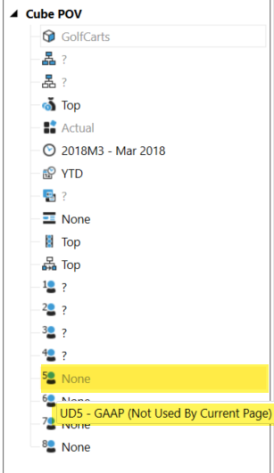 The Point -of -View panel supports the new User Defined Descriptions. Hovering over a selectable point-of-view member will display the defined description. Dimensions which are fixed, not selectable, will display the defined description and append “Not Used by Current Page”. See Application Properties and then User Defined Dimensions (Descriptions).