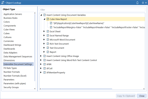 Once in the dialog box, select Extensible Document Settings. Expand Insert Content Using Document Variables and then expand Cube View Report. Select the line of syntax and click Copy to Clipboard to copy the first string.