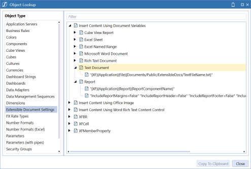 2. In the dialog box, select Extensible Document Settings. Expand Insert Content Using Document Variables and then expand Text Document. Select the line of syntax and click the Copy to Clipboard button to copy the string.