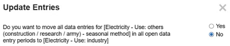 If you change the supplier for a site that already has data entered, you are asked if you want the data from the original supplier to migrate to the new supplier. If you select Yes, the data is moved in all open data entry periods. If you select No, then both suppliers display on the Home page for data entry. If you do not migrate the data, the data you enter for both suppliers will aggregate on the report. You cannot change supplier data if the Workflow is completed or if the profile is in the Completed status.