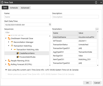 NOTE: Use the following format to define a MatchSetName value: Workflow Profile.Scenario. For example, in the previous image, the MatchSetName value is Houston.ActualTM. The Workflow Profile is Houston and the Scenario is ActualTM.