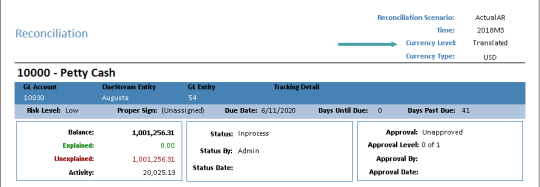 Detail items may also be created using any currency type maintained in OneStream and are automatically translated to Account, Local, and Reporting currencies upon save. Also, Account Groups may be created for accounts or entities that have different currency types, allowing child reconciliations to be translated and aggregated to a single reconciling currency type, for each currency level, at the Account Group level.