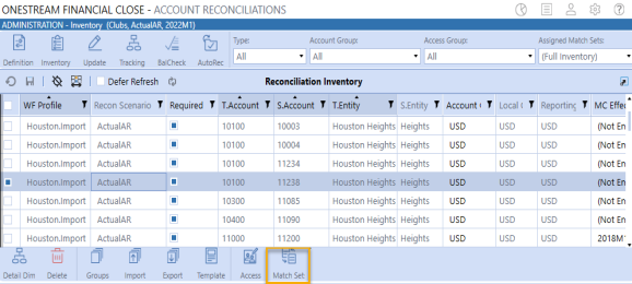 In Account Reconciliations, assign one or more match sets to a reconciliation in the inventory. After assigning match sets, you can filter the reconciliation inventory by the match sets assigned.