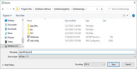 Browse to the following location: <installdrive>\Program Files\OneStream Software\OneStreamAppRoot\OneStreamApp, select the appsettings.json file and click Open