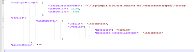 The following image shows the logging settings updated to include the Name, path, and rollingInterval values.