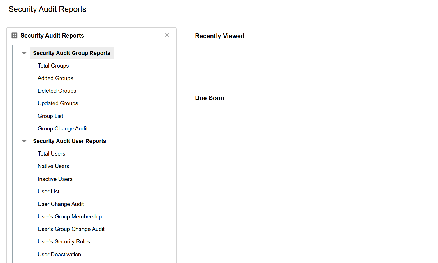 Security Audit Report includes Group and User reports. See View and Run Reports to learn how to generate any of these reports.