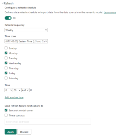 Send refresh failure notifications to: Choose to send failure notifications to the Semantic model owner, custom contacts, or both. Leave both fields blank if notifications are not required.