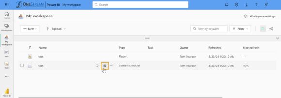 Hover over the Semantic model for the report and click the Schedule refresh icon.