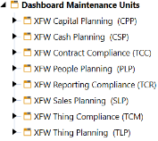 NOTE: The naming convention used to identify solution components is XFW <Solution Name> (Abbv). For example, People Planning becomes XFW People Planning (PLP).