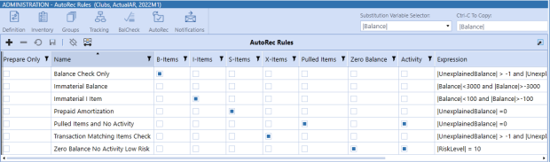 Pulled Items: Detail items pulled from the prior period will allow AutoRec. This logic will apply to all Detail T-Items and I-Items. If Allow Auto Pull Forward is set to Yes, Pulled Items must be selected for the AutoRec Rule to run successfully. See Reconciliation Inventory.