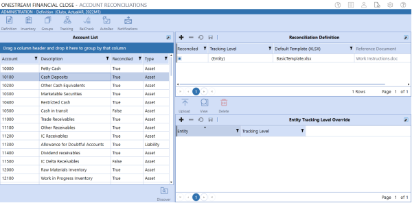 The initial Account List is generated based on the solution's Reconciliation Account Dimension and Reconciliation Account Member Filter settings in Global Options. These accounts are from the OneStream Cube, not from the General Ledger. This lists each of these accounts along with their account type. If an account has a related Reconciliation Definition, then it displays a value of Reconciled = True.
