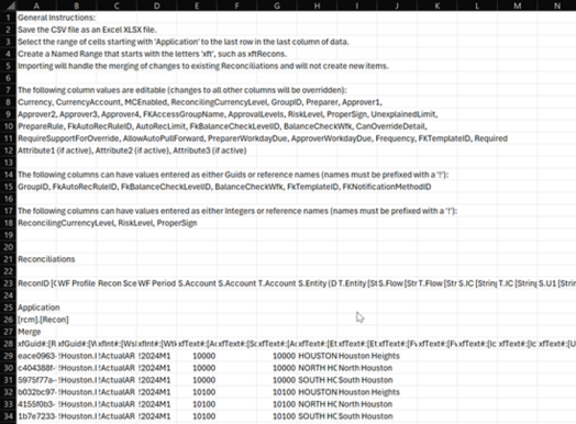 Export: Exports all reconciliations in the Reconciliation Inventory, except for Account Group type items, as a CSV file that can be opened in Excel. You must add a Named Range starting with the letters xft covering appropriate rows starting with the cell with the word Application in the top left cell. This file should then be saved in Excel .xlsx format. You must close this file before importing. Instructions are included in the exported file. This button is not accessible by Local Admins.