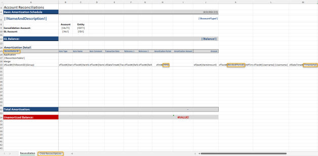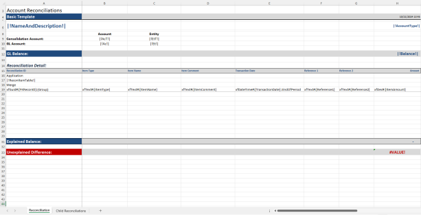 Replace: To change the template assigned to any existing Reconciliation Definition, select the Original Template and the New Template, and then click Replace. This change occurs in all Reconciliation Definitions. When viewing the Basic Template that comes with Account Reconciliations, there are Substitution Variables replaced with values from the reconciliation being processed. The following example is the design view.
