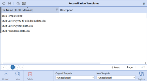 Reconciliation ID: A Reconciliation ID column with a drop-down menu is included in the following templates: Basic, MultiCurrencyMultiPeriod, MultiCurrency, and MultiPeriod. For account groups, the drop-down menu displays the related child reconciliations associated with the group as well as (Group); for individual reconciliations, the drop-down menu is blank. When you import an item with the template, the Reconciliation ID from the template will display in the Detail Items grid on the Reconciliations page.