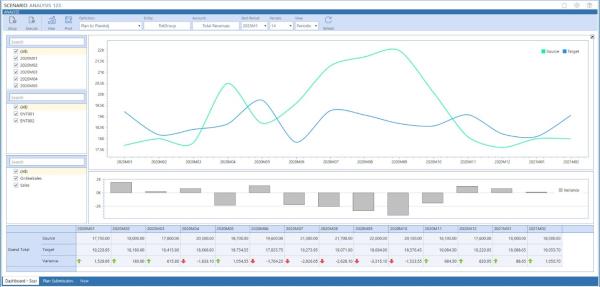 Provides a chart and grid so you can analyze variances between source and target scenarios. Additional Time, Entity, and Account filters are provided. |