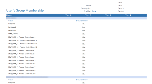 This report lists users and shows information about each of the groups to which each user belongs. For each user, the associated groups display along with an indicator that tells whether the group is an exclusion group. Records that appear in the report are based on the specified date range. You can also use the user name or description, the user’s enabled status, and any of the freeform text fields to further filter user records that appear on the report.