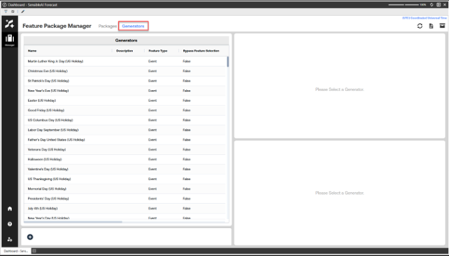 Feature Package Manager (FPM) is the SensibleAI Forecast workspace for organizing feature “Generators” into reusable “Packages” and applying those packages to projects. Generators can be Library Features or Event Generators. Packages serve as curated collections of generators that can be consistently reused and exported into SensibleAI projects.