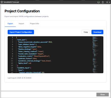 The user can either copy or download the project configuration in a JSON format.