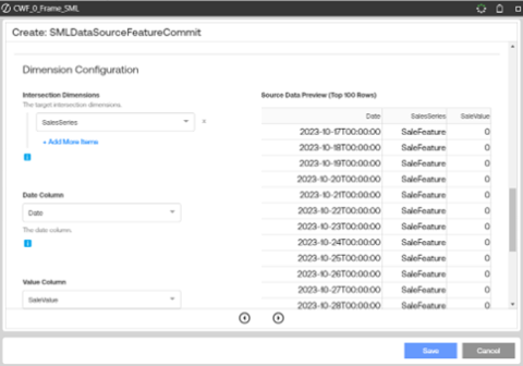 Continue specifying features and defining the data set by specifying any feature dimensions, value dimension, date dimension or location dimension for the data set to use in your SensibleAI Forecast model. This is basically matching the dimensions to be used for the feature data in your Sensible Learning Machine model to the dimensions reserved while creating a cube for the feature data source.