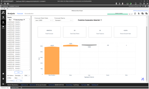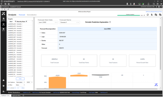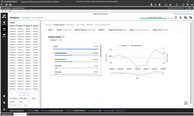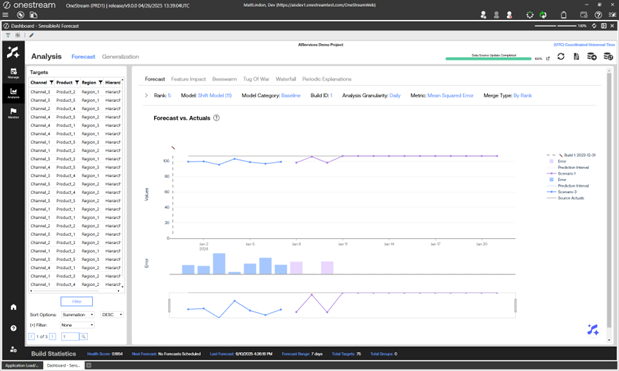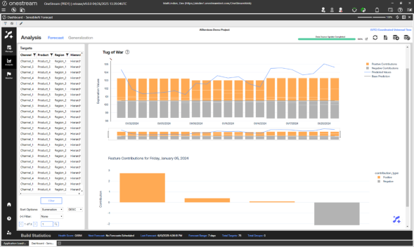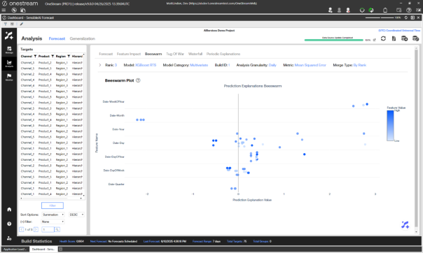 This page includes Forecast, Feature Impact, Beeswarm, Tug of War, Waterfall, and Periodic Explanation pages. Use the Forecast page in the Analysis section to analyze results from model forecasts, different builds, and different stages of the project. This page visualizes the forecasted values for each model and back filled actuals for each target. It is similar to the Arena Summary view of the Model Build phase Pipeline section, but this page displays in-production results.