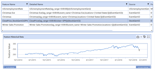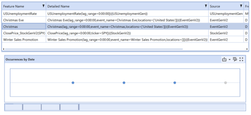 To view the historical and user input values of a Scenario, select different Features or Events from the Scenario Features table. With each selection change, the bottom pane will update with a time series view of Feature data and occurrence view of Event data: