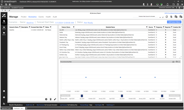 IMPORTANT: Only Scenarios for the current forecast period will be shown on the Scenarios page. Please ensure that all target and feature data sources are up-to-date and a Date Source Update job has been run for all data sources. This allows Xperiflow to generate an accurate Forecast Start Date.