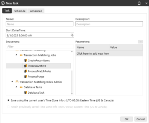 You can configure archiving and purging to run on a schedule using Task Scheduler. Set the ProcessArchive or ProcessPurge job. The scheduled job will look to the relevant settings at the time for archiving or purging, set up within the Match Sets and Data Retention pages. The PurgeProcess within Task Scheduler automatically looks to the archived tables. The Administrator can set the live tables or Both by adding the parameter PurgeTargetType.