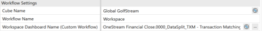 • Workspace Dashboard Name (Custom Workflow): Click Edit (…), select OneStream Financial Close – Transaction Matching - Data Split (TXM) - 0000_DataSplit_TXM from the drop-down list and then click OK.