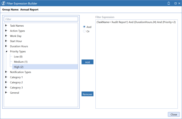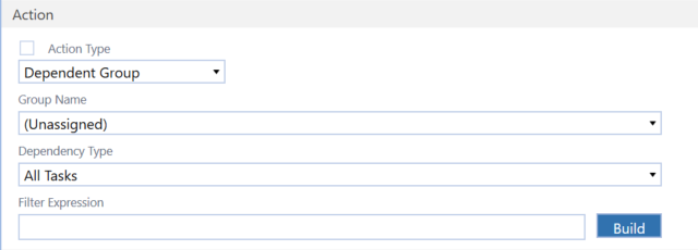 Change dependency type to Filtered Tasks and click Build to open the Filter Expression Builder dialog box. This lets you create an expression to meet the dependency requirement.