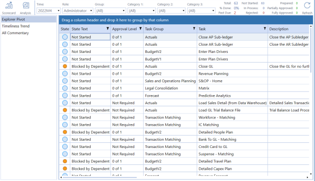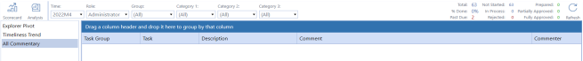 The Analysis page includes Explorer Pivot and All Commentary grids. You can reorder grids in the Explorer Pivot and All Commentary pages.