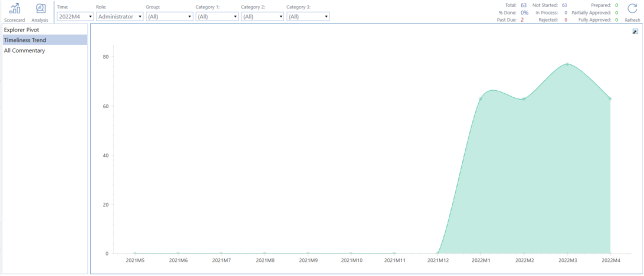 Provides the total number of on-time and late tasks for the selected time period over the trailing twelve months. Click on a node to open the Task Details dialog box with the filtered task list.