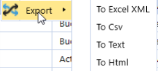 The grid data can be exported to Excel XML, CSV, Text, or HTML. Right-click anywhere on the grid and select Export, and then select the data export type.